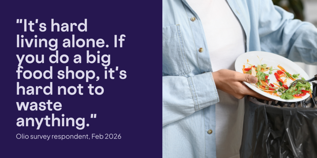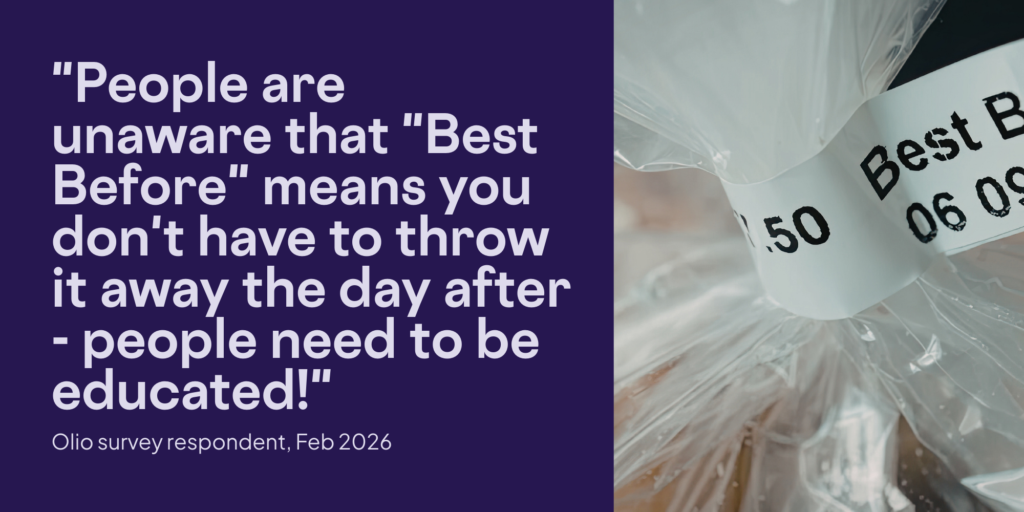 Food waste is not a values problem – among Olio’s user base, people care enormously. They told us that for them, food waste happens more as a result of current systems and habits. The conditions of everyday life – busy schedules, large pack sizes, and confusing labels – make waste almost inevitable, even for those trying hard to prevent it.